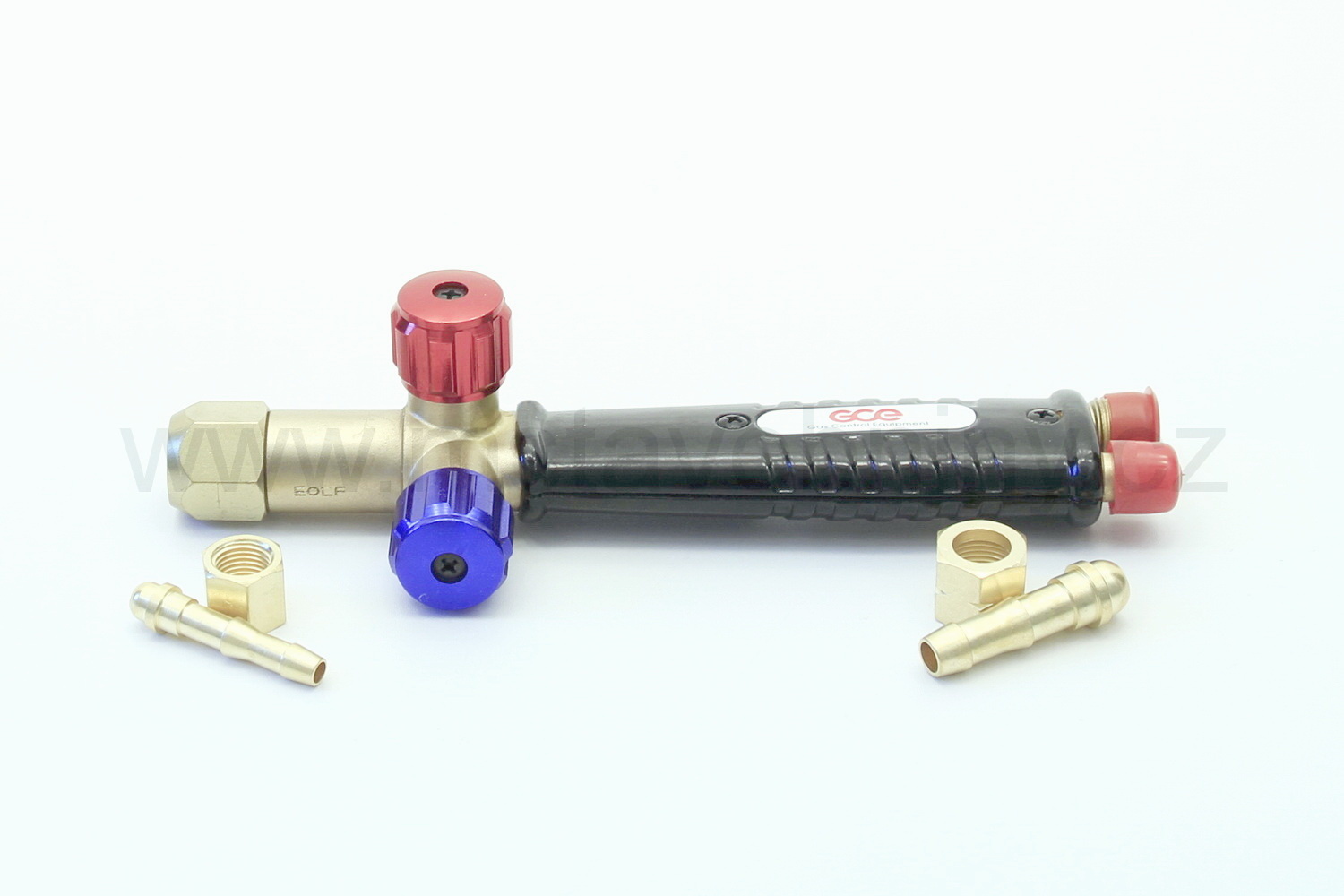 Autogenní rukojeť U7 pro řezací a svařovací nástavce RN7, RNK7, RN BIR. Použitelná pro hořlavé plyny acetylen a propanbutan. Součástí dodávky jsou matice a hadicové nástavce (6 a 8 mm).
