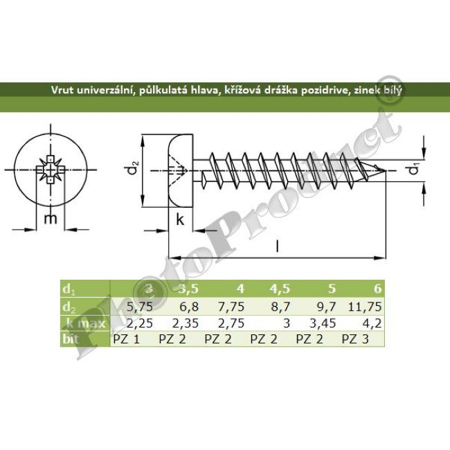 Vrut univerzální půlkulatá hlava, křížová drážka pozidriv, zinek bílý.