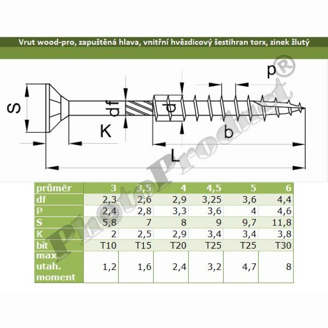 Vrut Wood-Pro, zapuštěná hlava, vnitřní hvězdicový šestihran, torx, zinek žlutý.