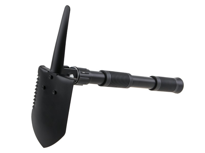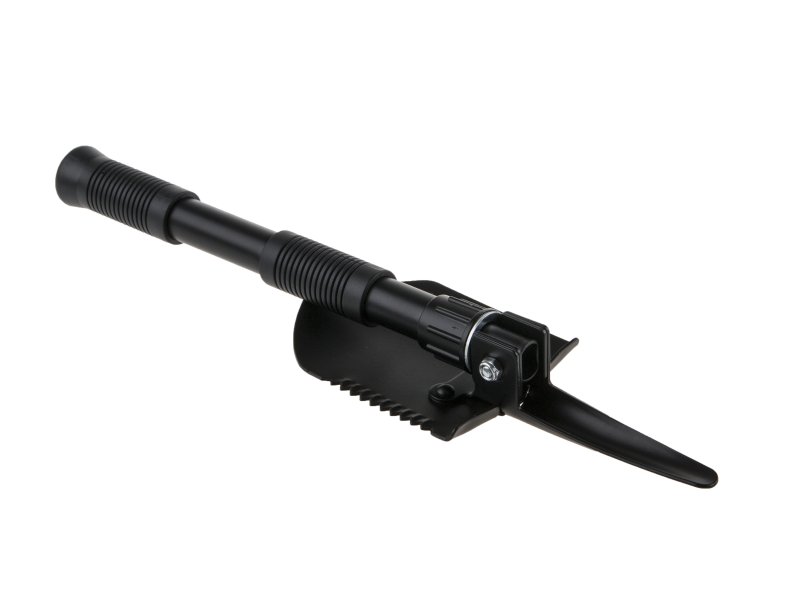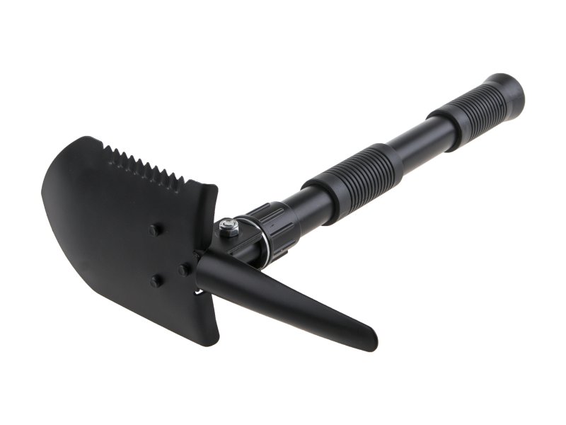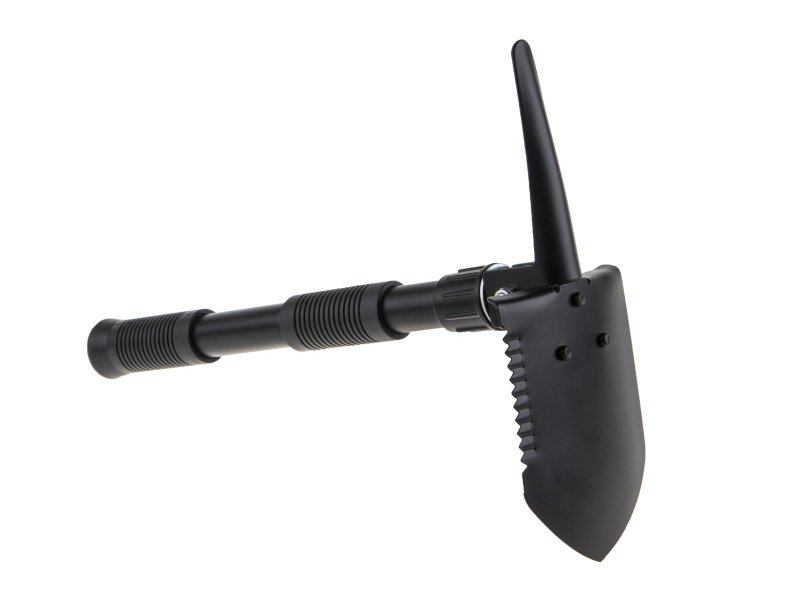 Malá skládací lopatka s hrotem. Lze použít jako lopatka, rýč, motyka, pila, víceúčelový hrot. Dvě gumové protiskluzové rukojeti. Vyrobeno z ocelového plechu a trubek. Odolný nylonový obal s poutkem na opasek.